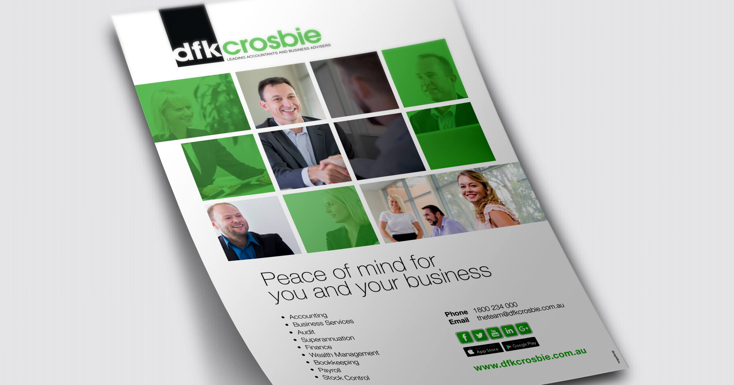 DFK Crosbie are a well recognised and established business that have been providing accounting and business advice for over 50 years. Graphika have had the pleasure of working closely with them to reproduce most of their marketing material, including brochures, press, internal documents and we art directed their photography. Logo design, business cards, letterheads, with compliments, website design, branding, photography, accounting, business.
